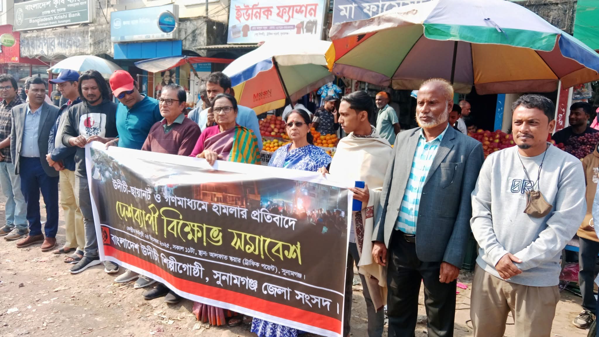 উদীচী-ছায়ানট ও গণমাধ্যমে ন্যাক্কারজনক হামলার প্রতিবাদে কেন্দ্রীয় কর্মসূচির অংশ হিসেবে সুনামগঞ্জে মানববন্ধন ও প্রতিবাদ সমাবেশ অনুষ্ঠিত হয়েছে।