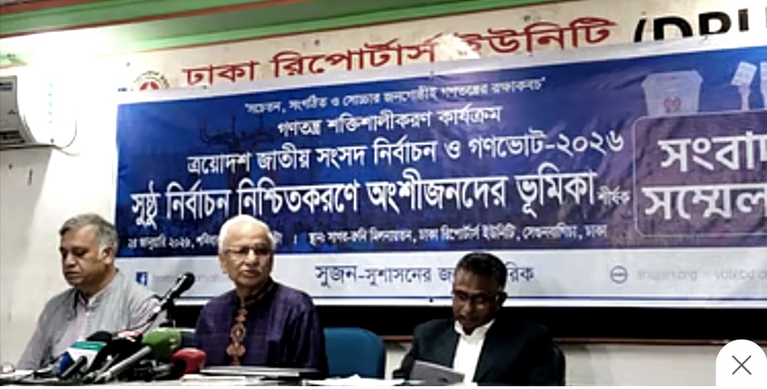 আজ শনিবার (২৪ জানুয়ারি, ২০২৬) ঢাকা রিপোর্টার্স ইউনিটিতে আয়োজিত এক সংবাদ সম্মেলনে সুজন সম্পাদক বদিউল আলম মজুমদার এবং কেন্দ্রীয় সমন্বয়কারী দিলীপ কুমার সরকার আগামী নির্বাচন ও নির্বাচন কমিশনের (ইসি) ভূমিকা নিয়ে বেশ কিছু গুরুত্বপূর্ণ পর্যবেক্ষণ তুলে ধরেন।