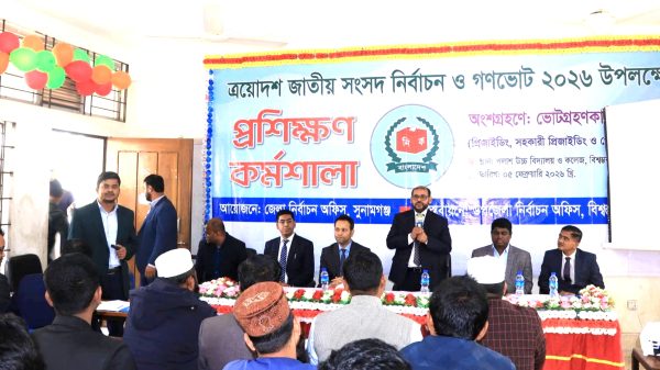 বিশ্বম্ভরপুরে নির্বাচনী কর্মকর্তাদের প্রশিক্ষণ কর্মশালা সম্পন্ন নিজস্ব প্রতিবেদক, সুনামগঞ্জ | ০৫ ফেব্রুয়ারি, ২০২৬ ত্রয়োদশ জাতীয় সংসদ নির্বাচন ও গণভোট-২০২৬ অবাধ, সুষ্ঠু ও নিরপেক্ষভাবে সম্পন্ন করার লক্ষ্যে সুনামগঞ্জের বিশ্বম্ভরপুর উপজেলায় ভোটগ্রহণকারী