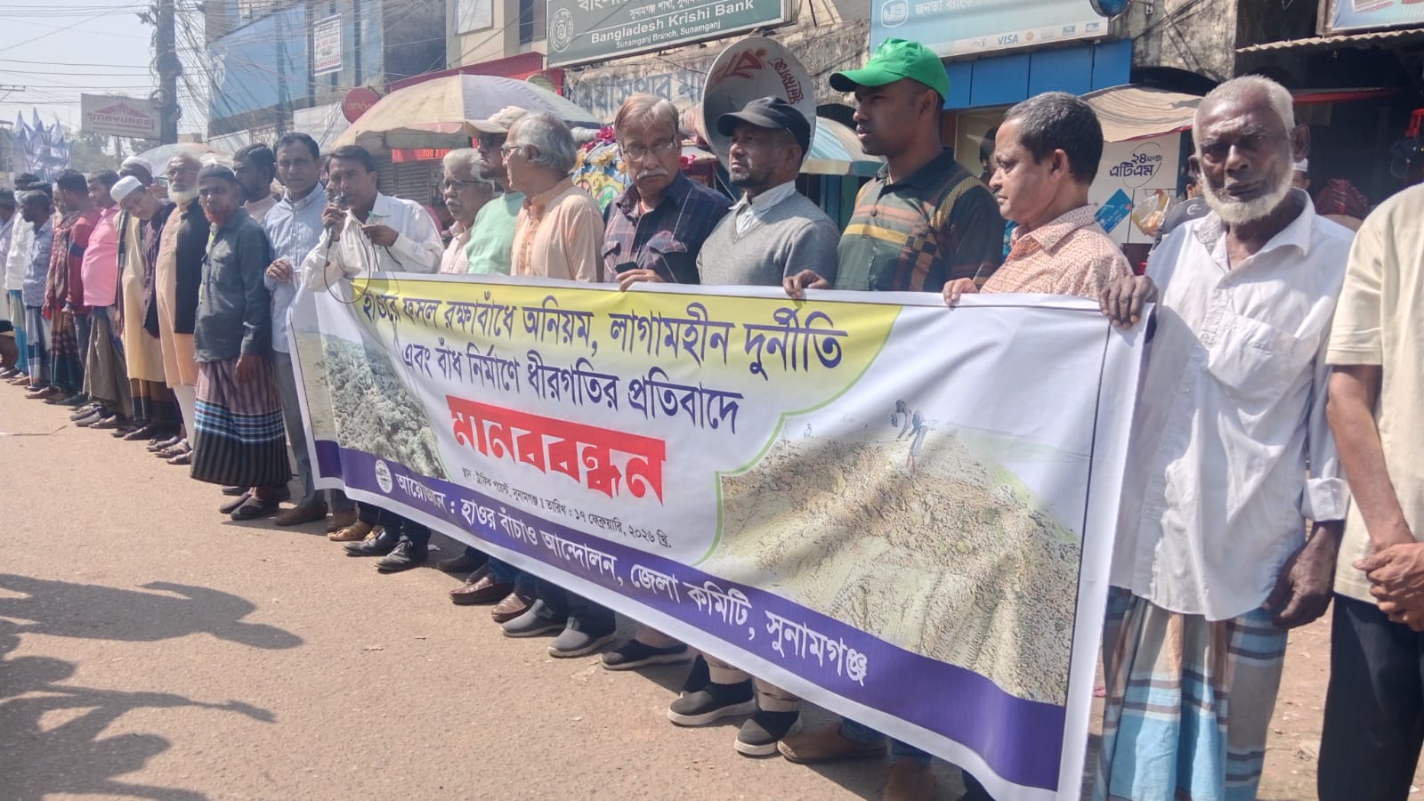 নিজস্ব প্রতিবেদক, সুনামগঞ্জ সুনামগঞ্জের লাখ লাখ কৃষকের স্বপ্নের বোরো ফসল রক্ষায় নির্মিত বাঁধে অনিয়ম, দুর্নীতি ও ধীরগতির প্রতিবাদে রাজপথে নেমেছে 'হাওর বাঁচাও আন্দোলন'। মঙ্গলবার সকালে জেলা শহরের ট্রাফিক পয়েন্টে আয়োজিত এক বিশাল মানববন্ধনে নেতৃবৃন্দ হুঁশিয়ারি দিয়ে বলেন, ২৮ ফেব্রুয়ারির মধ্যে কাজ শেষ না হলে এবং দুর্নীতি বন্ধ না হলে সংশ্লিষ্টদের বিরুদ্ধে প্রতিটি উপজেলায় মামলা দায়ের করা হবে।