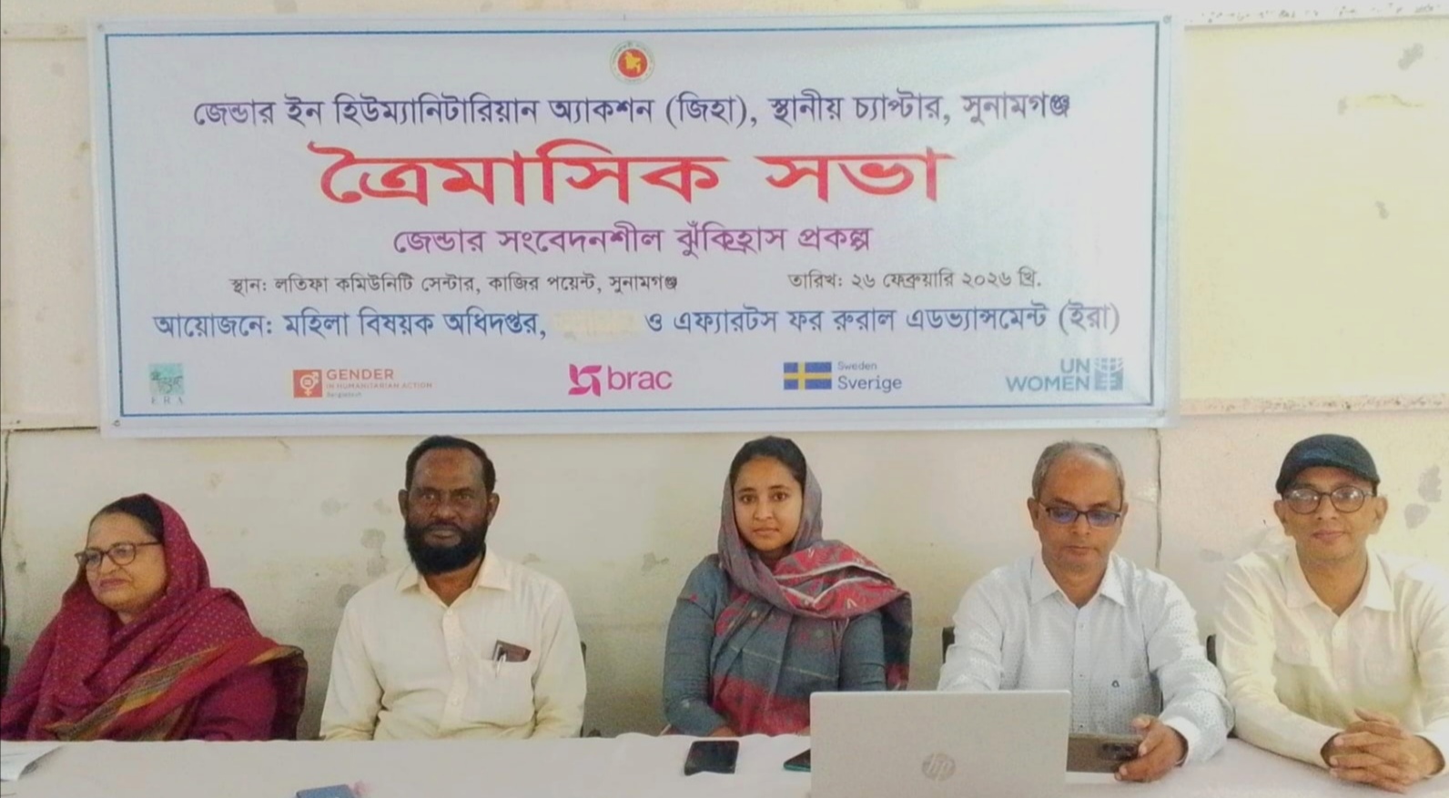 নিজস্ব প্রতিনিধি: দুর্যোগকালীন সময়ে জেন্ডার বৈষম্য নিরসন ও ঝুঁকি হ্রাসের লক্ষ্য নিয়ে সুনামগঞ্জে অনুষ্ঠিত হয়েছে 'জেন্ডার ইন হিউম্যানিটারিয়ান অ্যাকশন (জিহা) স্থানীয় চ্যাপ্টার'-এর ত্রৈমাসিক সমন্বয় সভা। বৃহস্পতিবার বেলা ১১টায় জেলা শহরের একটি কমিউনিটি সেন্টার মিলনায়তনে এই গুরুত্বপূর্ণ সভাটি অনুষ্ঠিত হয়।