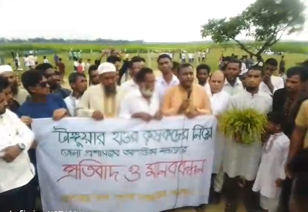 সুনামগঞ্জের টাঙ্গুয়ার হাওরপাড়ের কৃষকদের নিয়ে জেলা প্রশাসকের দেওয়া ‘আপত্তিকর’ বক্তব্যের প্রতিবাদে ফুঁসে উঠেছে স্থানীয় জনতা। আজ শনিবার (২১ মার্চ) বেলা ১১টায় তাহিরপুর উপজেলার টাঙ্গুয়ার হাওরপাড়ের লামাগাঁও বাজারে এক বিশাল মানববন্ধন কর্মসূচি পালিত হয়। পবিত্র ঈদুল ফিতরের জামাত শেষে হাওরপাড়ের বিভিন্ন গ্রাম থেকে আসা শত শত কৃষক, জেলে ও সাধারণ মানুষ এই প্রতিবাদে শামিল হন।