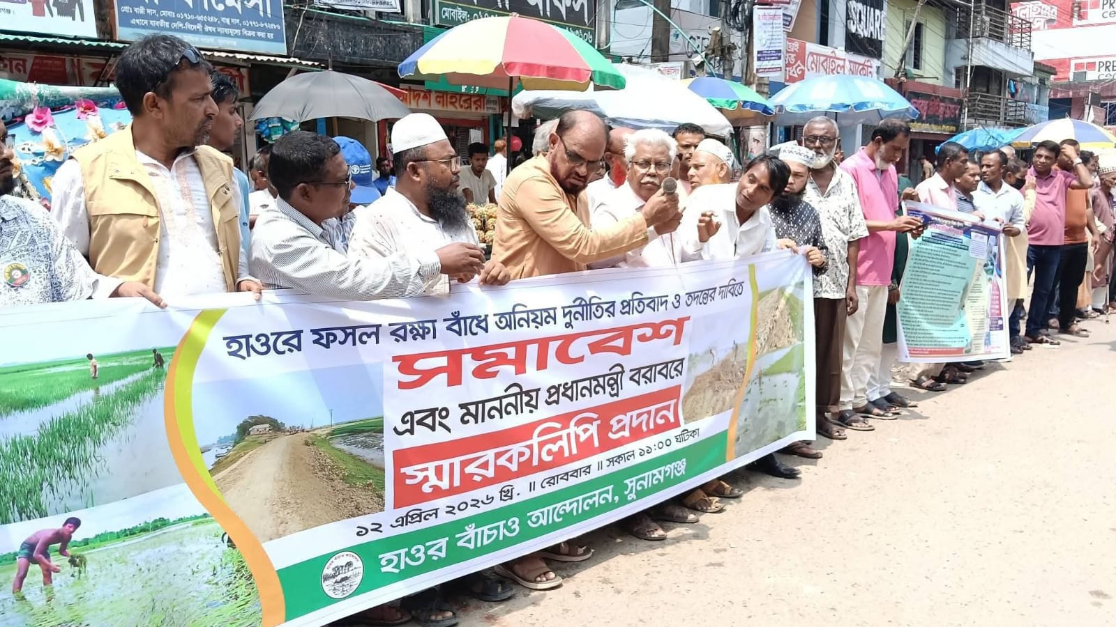 সুনামগঞ্জের দিগন্তজোড়া হাওরের বোরো ফসল রক্ষায় নির্মিত বাঁধে ভয়াবহ দুর্নীতি, অনিয়ম ও অব্যবস্থাপনার প্রতিবাদে রাজপথে নেমেছেন হাজার হাজার কৃষক। রোববার সকালে 'হাওর বাঁচাও আন্দোলন'-এর ব্যানারে আয়োজিত এই বিক্ষোভ সমাবেশে কৃষকদের ক্ষোভ আর স্লোগানে উত্তাল হয়ে ওঠে সুনামগঞ্জ জেলা শহর।